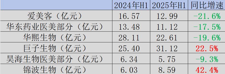 各大醫美企業披露的2025年中報中,除正處於業績釋放階段的錦波生物和鉅子生物外,其他醫美頭部公司均出現不同程度的營收滑坡,這足以説明醫美產品的供需天平正在向另一端傾斜。