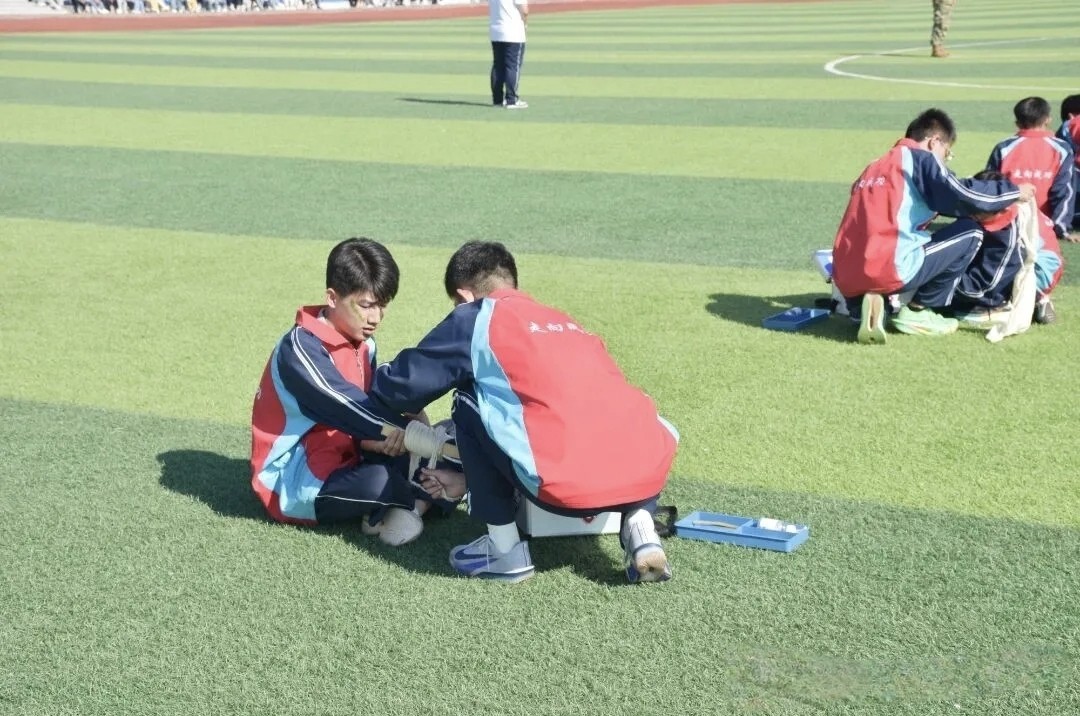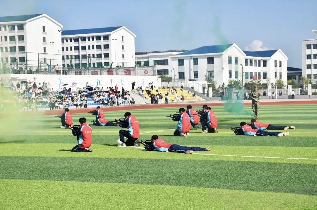 分列式後,精彩紛呈、氣勢磅礴的軍事科目彙報表演輪番上演,將現場氣氛推向高潮:擒敵拳方陣揮拳,過肩,摔擒,一招一式,沉穩有力。軍體操方陣的軍體拳表演威震四方,他們以抖擻的精神、矯健的軍姿展現了他們的鐵血豪情。刺殺操利落出槍,步伐鏗鏘,一招一式,鍛造血性擔當,一刺一喊,宣戰似火驕陽。匕首操方陣的同學目光篤定,手持利刃,勢如劈竹,清脆吶喊響徹雲霄。旗語操方陣的表演,體現了同伴之間的默契,整齊劃一的動作,團結協作的精神,精準傳遞信息,彰顯高效指揮與團隊默契。擒拿術方陣向師生們展示擒拿術的基本技巧和實戰用法。戰術方隊和醫療救護方隊的表演更是將彙報表演推向高潮,同學們在模擬的戰場環境中,靈活運用戰術動作,匍匐前進、躍進、射擊、包紮傷口等動作一氣呵成,充分體現了軍事訓練的實戰性和嚴謹性,贏得了現場觀眾的陣陣掌聲和喝彩。