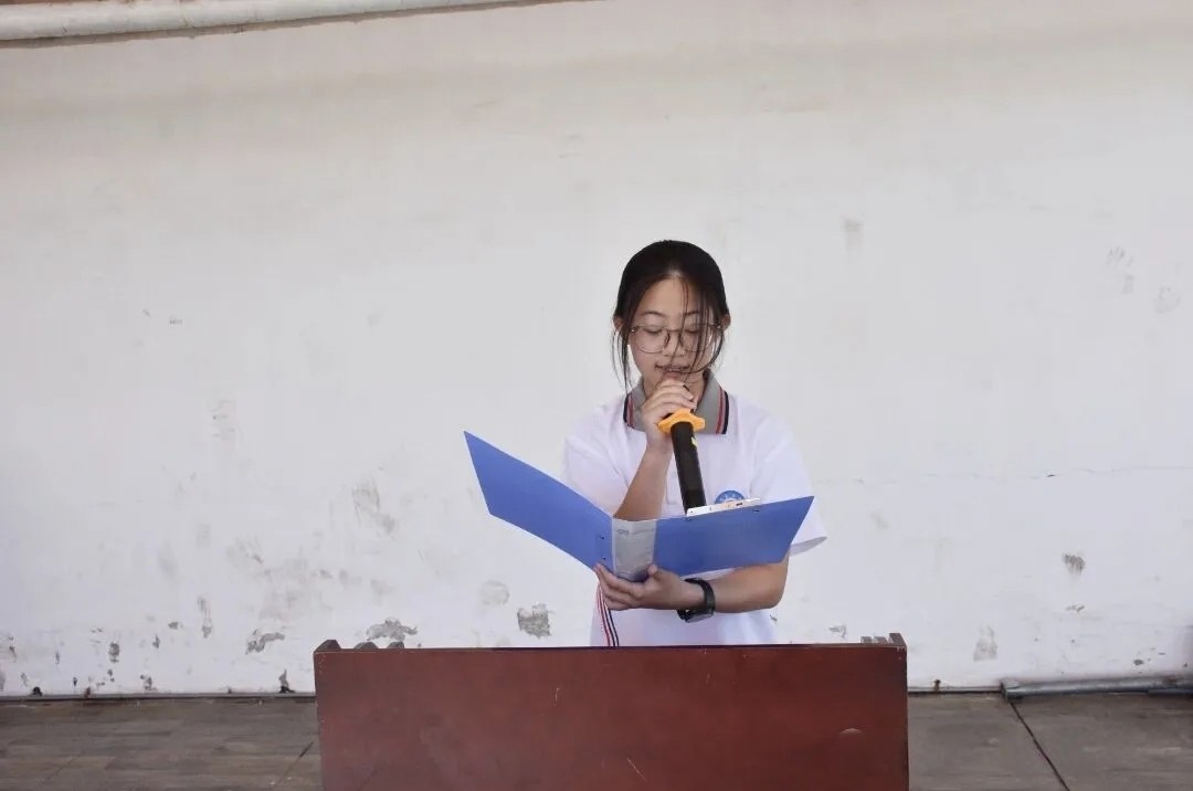 高一年級413班楊露瑤表代表高一全體參訓同學向辛勤付出的教官和老師們致以崇高敬意和衷心感謝。她回首這段軍訓時光,汗水與歡笑交織,挑戰與成長並存。從最初站軍姿時的搖晃不已,到如今能挺直腰桿紋絲不動;從齊步走時的雜亂無章,到分列式上的整齊劃一,學會了用堅持對抗疲憊,用專注克服困難。軍訓雖然結束,但它帶給同學們的勇氣、堅持與責任,將會成為未來三年最珍貴的財富!