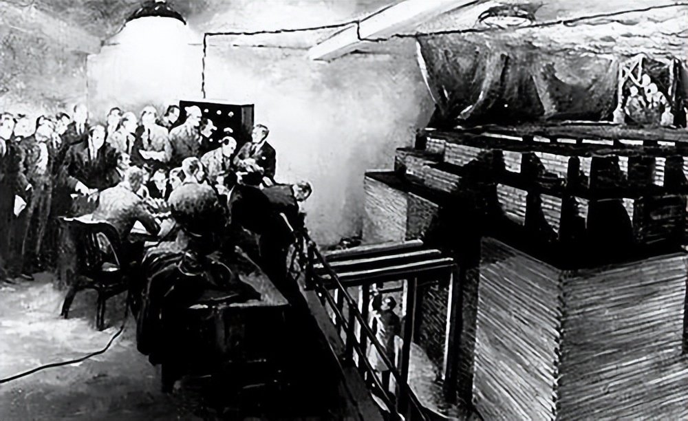 第一座達到臨界狀態的反應堆(油畫)。 1942年12月2日,費米領導的團隊在芝加哥大學實現了人類首次受控鏈式反應。