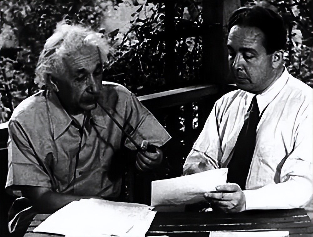 愛因斯坦(左)及西拉德在 1946 年紀錄片《原子能之力量》中重現給羅斯福總統寫信時的討論場景。