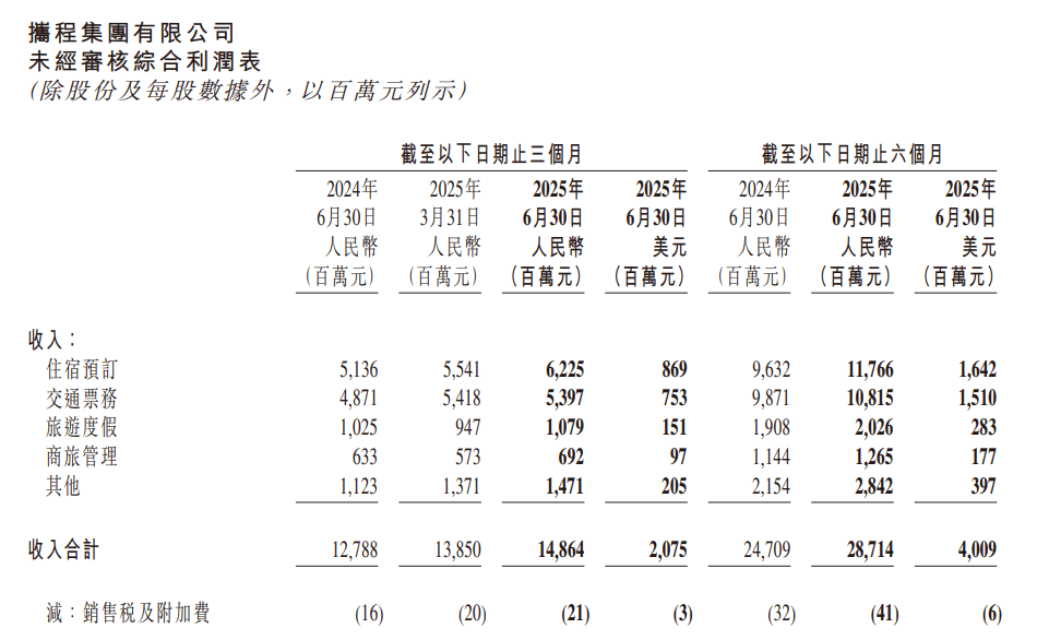 8月28日,攜程集團(納斯達克:TCOM;香港聯交所:9961)公佈了 2025年第二季度未經審計財務業績。第二季度,攜程集團實現營收達148億元,同比增長16%,主要得益於越來越強勁的旅遊需求,尤其在節假日期間表現突出。第二季度實現歸母淨利潤為48億元,上半年同期為38億元,同比增長26%。