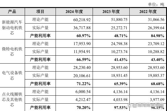 而根據招股書顯示,報告期各期,華新精科新能源汽車驅動電機鐵芯的產能利用率分別為84.98%、48.71%和60.97%。募資額的六成用於擴產的新能源車用驅動電機鐵芯項目,可期內產能利用率明顯未飽和,華新精科募投的合理性及必要性引起外界不少質疑聲。