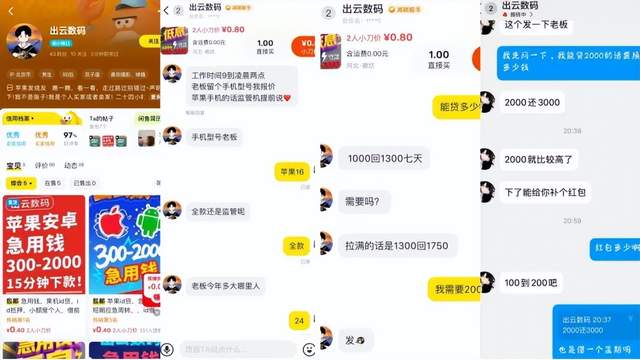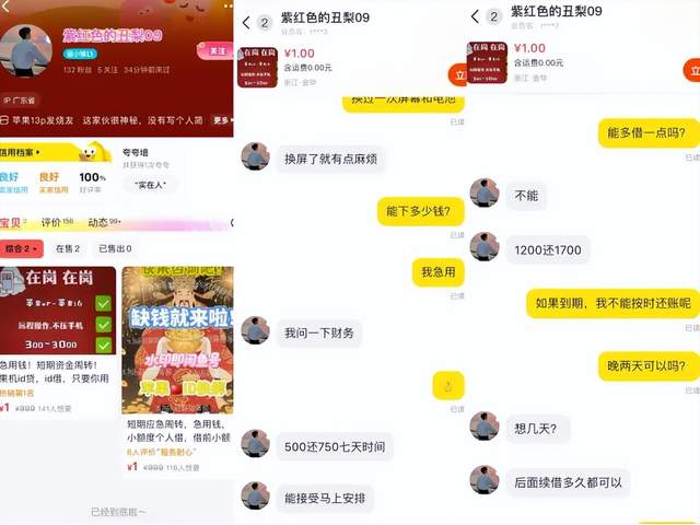 隨機聯繫一位暱稱為“出雲數碼”的閒魚用户,對方公開表示:“蘋果16全款可以借1000元,七天後還款1300元;借1300元需還1750元;若借2000元,七天還款為3000元”。即便對方主動提出可補貼100-200元紅包以示“利息高”,其實際年化利率依然遠超國家允許的36%紅線,構成典型高利貸。