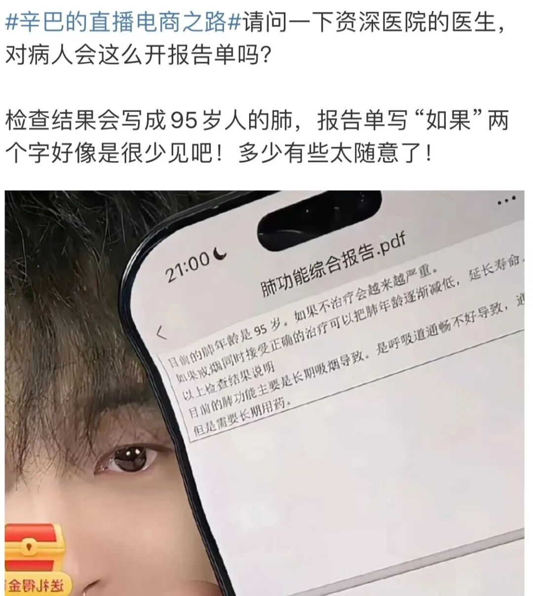 辛巴還在直播間展示了一份自己的醫學報告,自述肺功能相當於95歲老人,伴有肺氣腫和肺大皰。