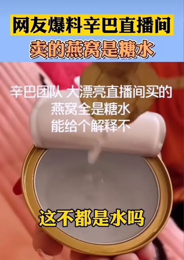 辛巴氣不過,在直播間將這款即食燕窩打開,用勺子盛起一勺白色固裝晶體,傲慢地説:“你告訴我這是不是好東西?就算我傾家蕩產,也要告你們造謠誹謗!”