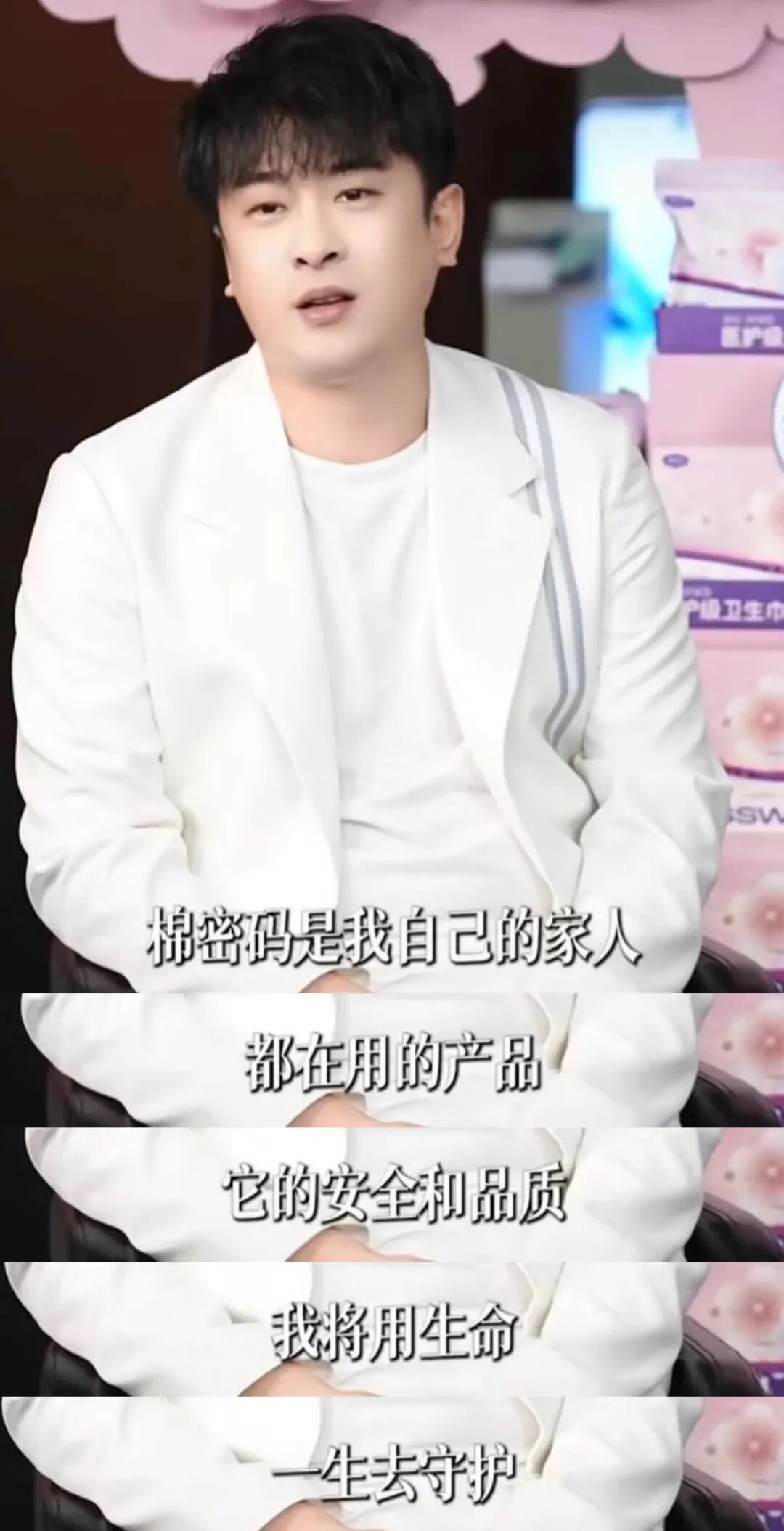 他的眼角含有淚水,煽情意味明顯,唯獨對自創品牌“棉密碼”衞生巾的致癌物風波,隻字未提。