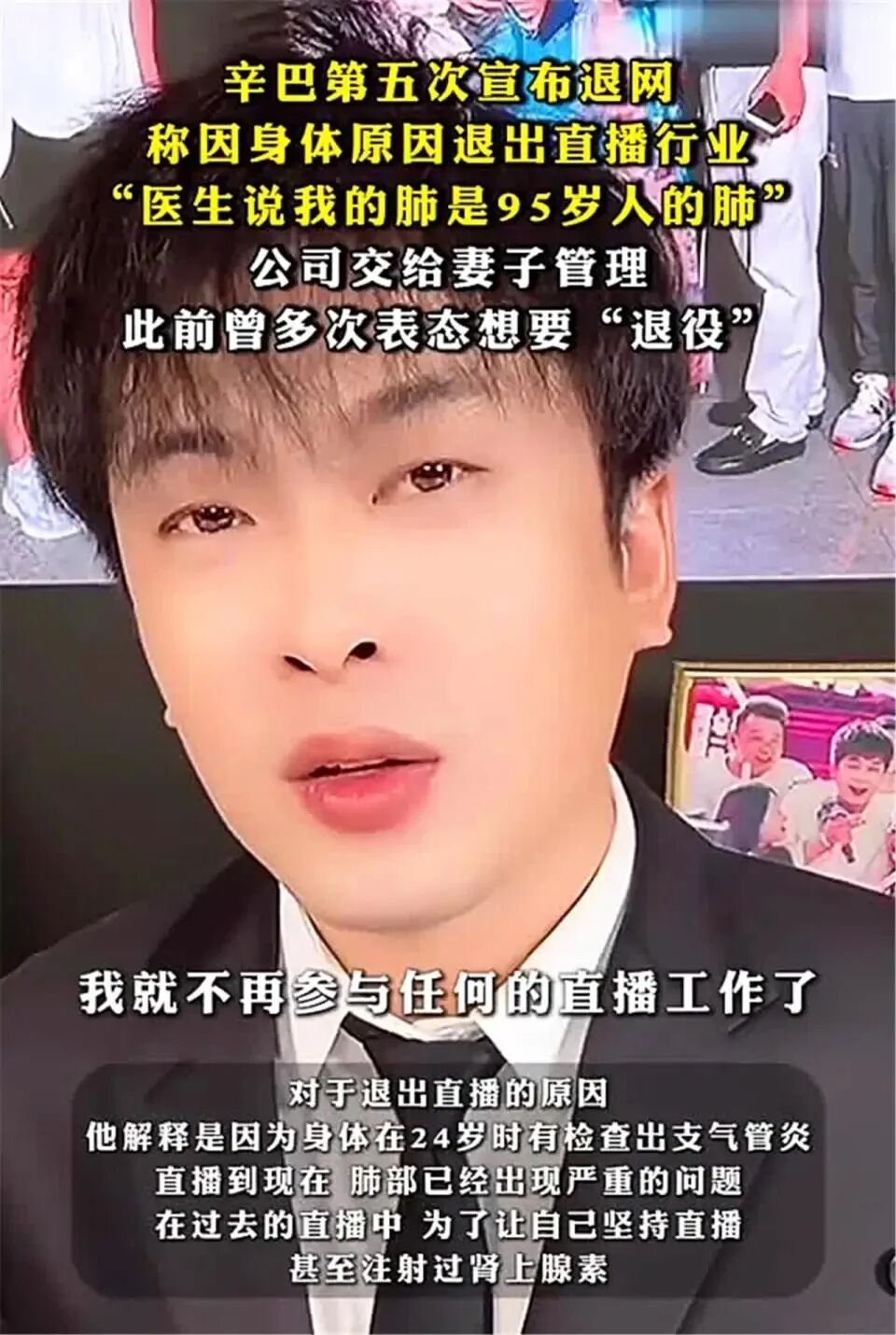 8月18日晚,辛巴宣佈退出直播行業,原因是身體出現嚴重危機,在檢查肺部後,醫生説他的肺部像95歲的人,如果不治療,肺的壽命可能只剩8到10年。