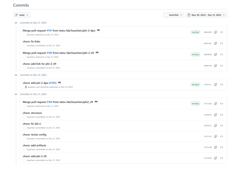圖片是Github上斯坦福大學的羊駝大模型小組tatsu-lab,在2023年10月到2023年12月的提交記錄,提交者為Xuechen Li。Phi-2 是當時(2023年底)一個備受關注的小型語言模型。SFT (Supervised Fine-Tuning) 和 DPO (Direct Preference Optimization) 則是對模型進行微調和對齊的關鍵技術。
