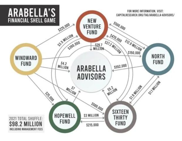 2012年至2018年期間,Arabella自身從私人基金會和其他非營利組織獲得了總計約610萬美元的捐贈,這還不包括其自身管理的網絡。Arabella的主要投資者是蘇珊·湯普森·巴菲特基金會(投資金額190萬美元,由億萬富翁沃倫·巴菲特積極資助)以及大衞和露西爾·帕卡德基金會(投資金額48萬美元)。Arabella自身運營着六個非營利組織,這些組織都是獨立的法人實體。它們全都充當着許多其他中左翼激進組織的孵化器和加速器,這些組織都不是獨立的非營利組織。Arabella非營利組織網絡並非由Arabella直接資助,而是由個人捐助者資助,其中大多數是左傾基金會。因此,Arabella顧問基金自成立以來,在2006-2020年的財務報告中顯示出高增長。報告的總收入為47億美元,支出為34億美元。此外,Arabella 的六個非營利組織在2008年至2021年期間向該公司支付了至少2.3億美元的管理費。該網絡中的基金還報告稱,2013年至2017年期間的總收入為16億美元,2016年至2017年期間收入增長了41%。