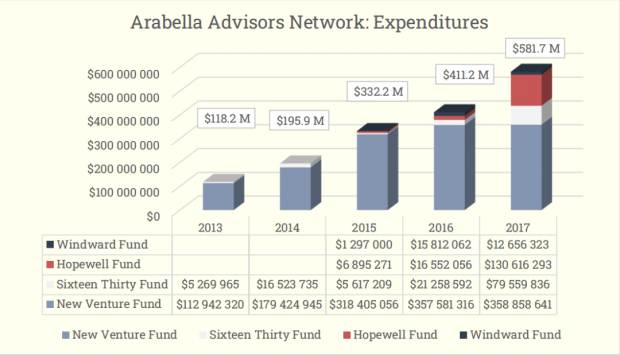2013年至2017年Arabella管理的非營利組織的收入:新風險基金、十六三十基金、迎風基金和霍普韋爾基金。
