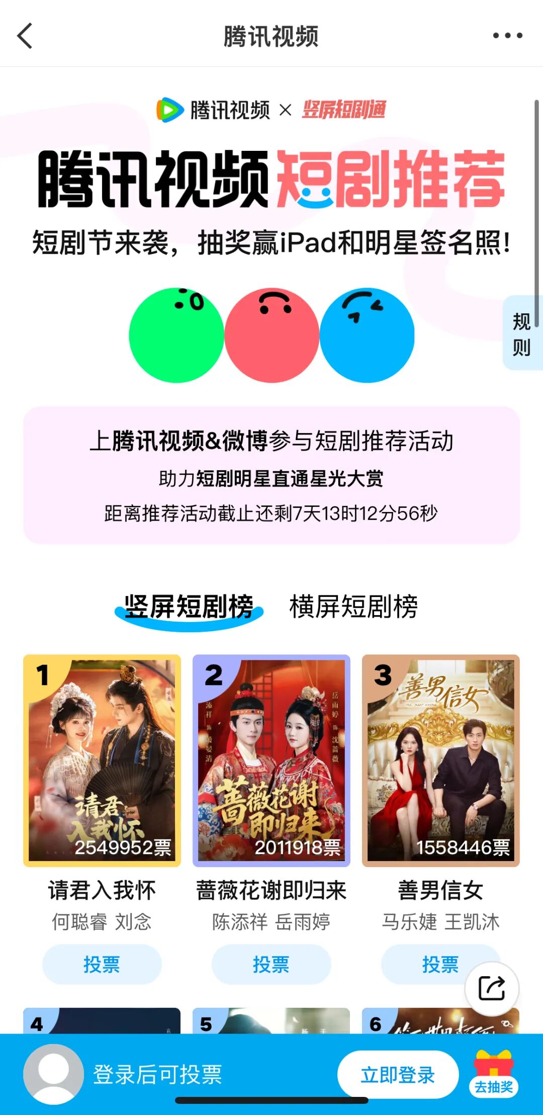 騰訊視頻則在春節檔規格上升級,聯合微博打造“騰訊視頻短劇節”,網羅三十餘橫豎人氣演員直播營業、福利派送,**打榜活動更拿出了“TOP1主演直通星光大賞”的彩頭,目前豎短榜單TOP3都已投到幾百萬票。**不得不説,薑還是老的辣。