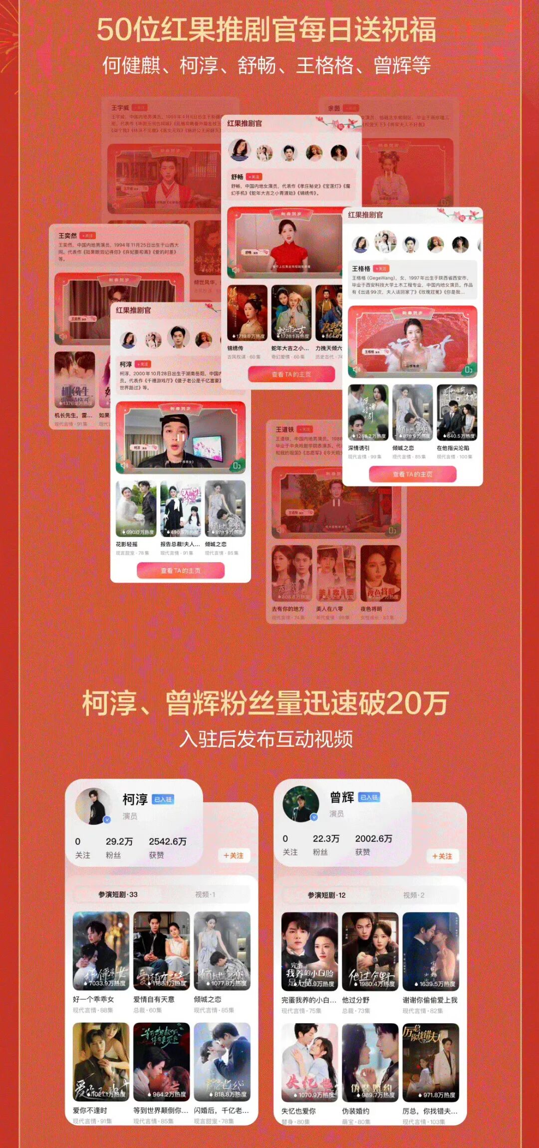紅果坐穩免費短劇第一平台後,於春節檔推出一系列運營活動:除了百部新劇,還有短劇紅人們的團建綜藝《出發吧短劇!》;邀請到柯淳、曾輝等22位短劇演員入駐,策劃了50位短劇紅人作為“推劇官”每日視頻送祝福;嘗試新劇的平台X廠牌X演員站內合力宣發,首次出演短劇的舒暢不僅入駐紅果,還空降評論區互動。