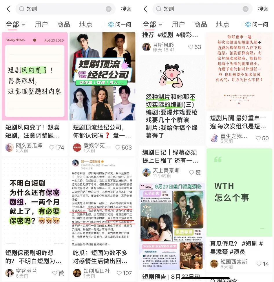 當然,小紅書在短劇生態中的首要定位肯定還是社區。除了有討論與二創習慣的短劇用户,大量演員、廠牌、從業者、營銷號都在小紅書活躍,很多爆料、話題或選角瓜都是由小紅書發酵到微博、豆瓣去的——這也是短國與內娛的一大差異。