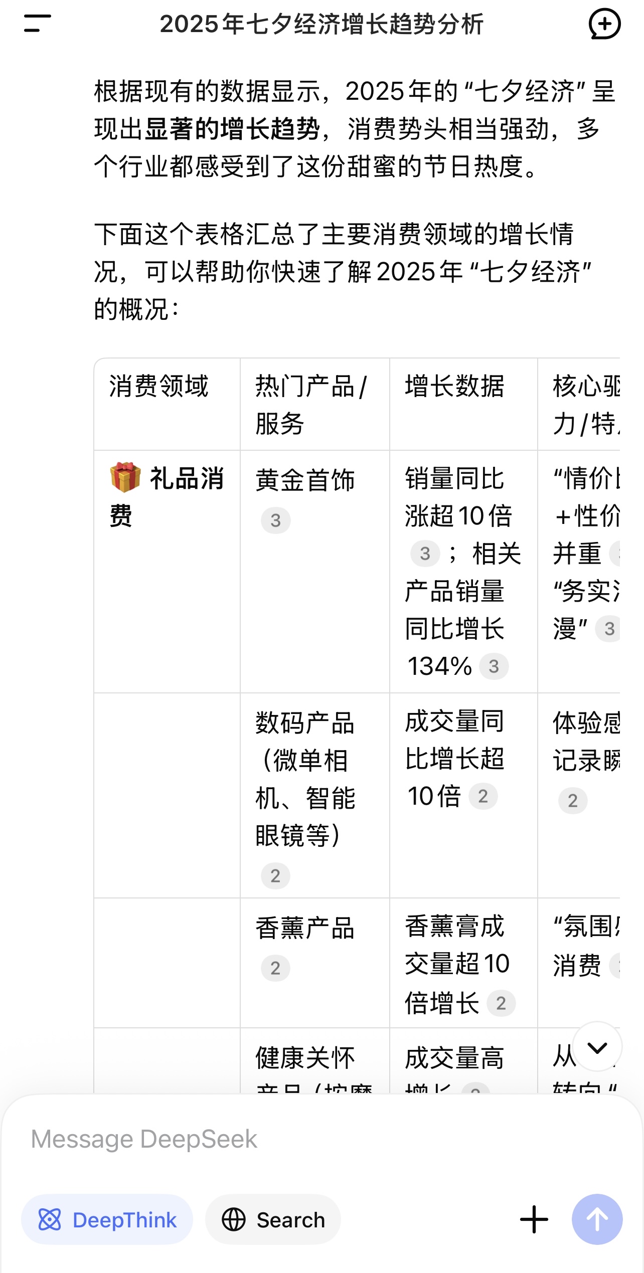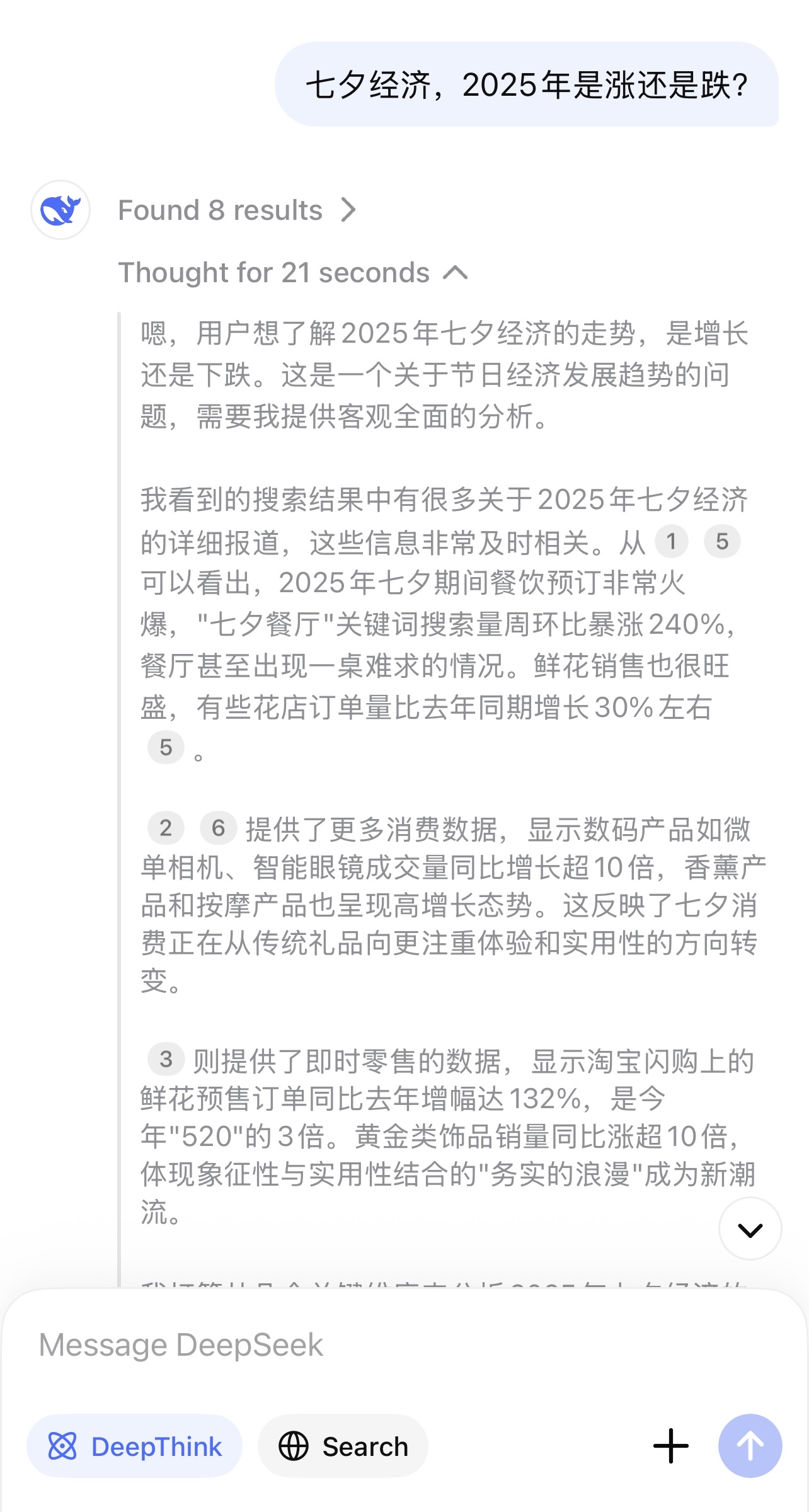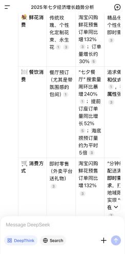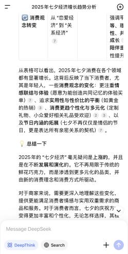 但是,如果你打開抖音,“七夕”後面的關聯詞都是“崩盤”“冷清”“下滑”“危機”。然而,你若問deepseek,2025年七夕經濟是漲還是跌,deepseek明確給出的答覆是:漲。