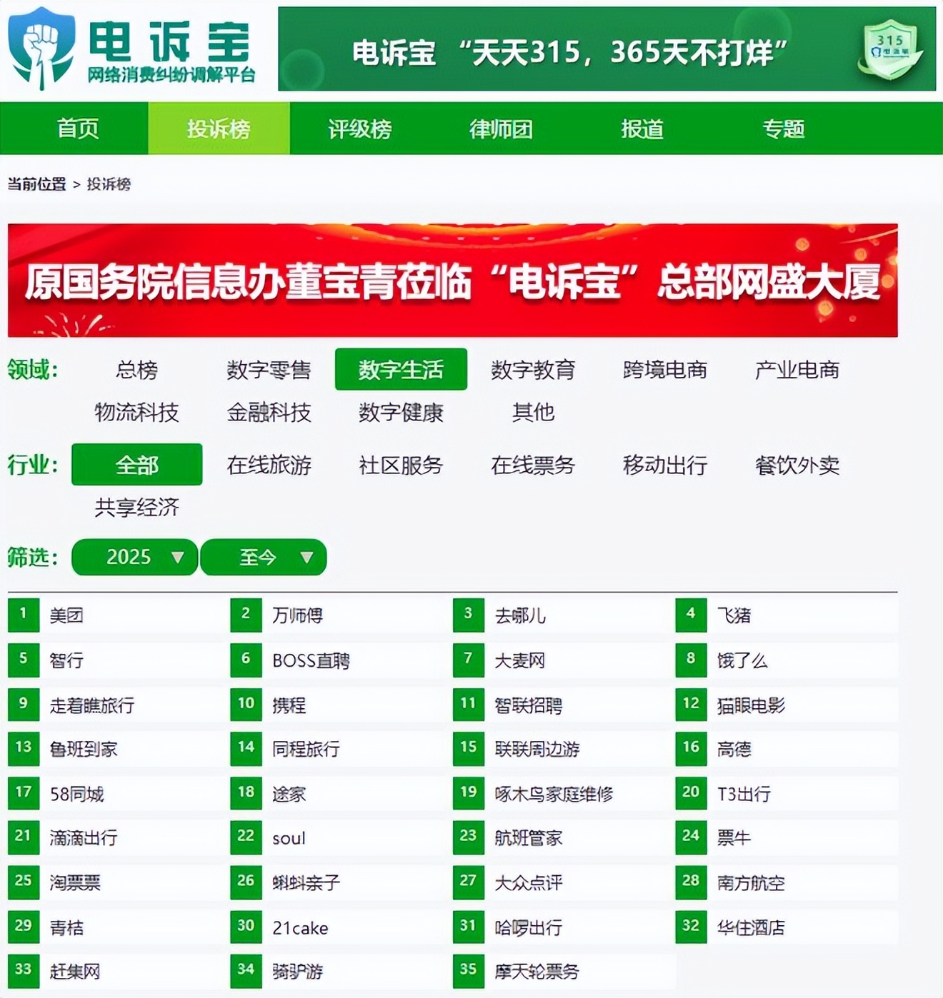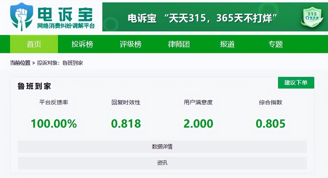 2025年至今,“電訴寶”受理投訴中涉及的數字零售領域用户有效投訴顯示(依據投訴量排行),“魯班到家”排名第13位。最新評級為**“建議下單”**。