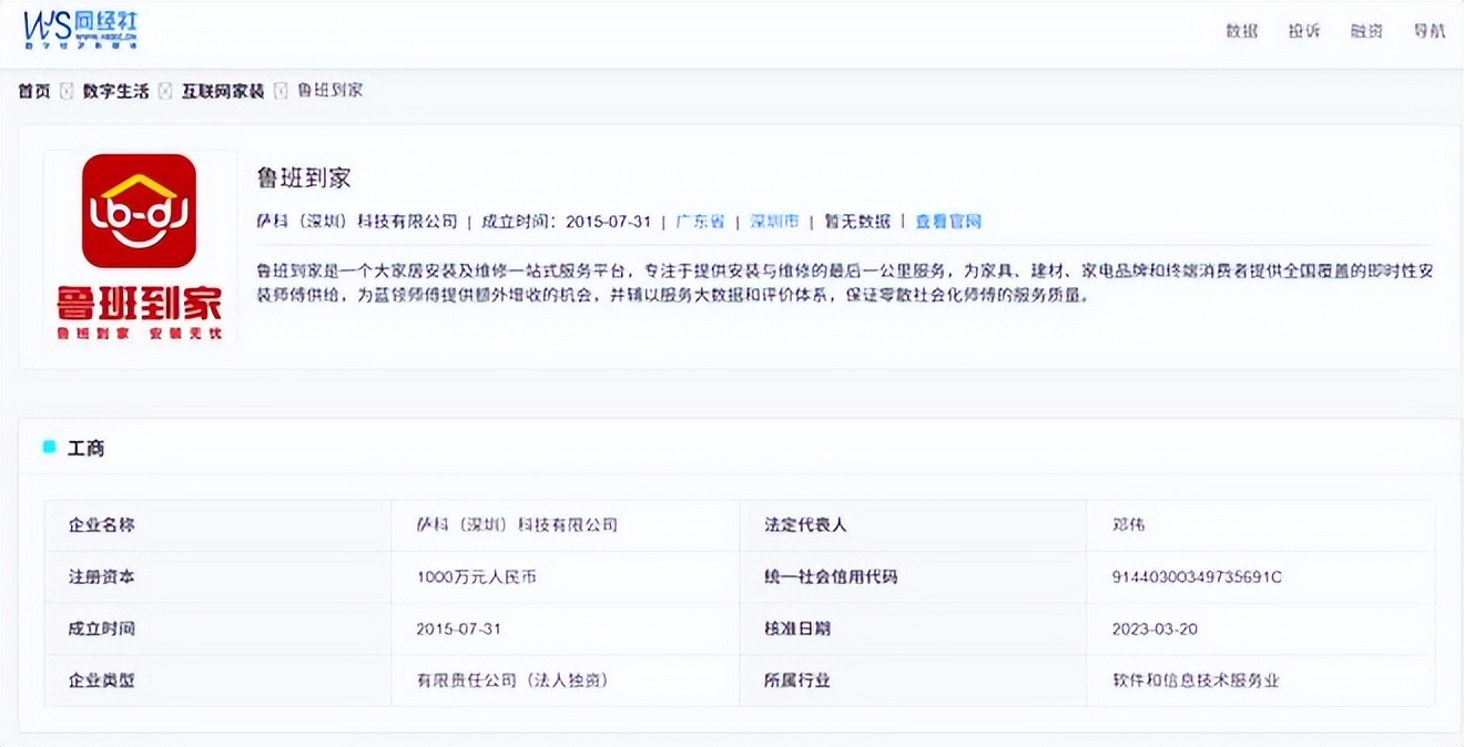 網經社企業庫顯示,魯班到家屬於薩科(深圳)科技有限公司,成立於2015年7月31日,位於廣東省深圳市,法定代表人為鄧偉。