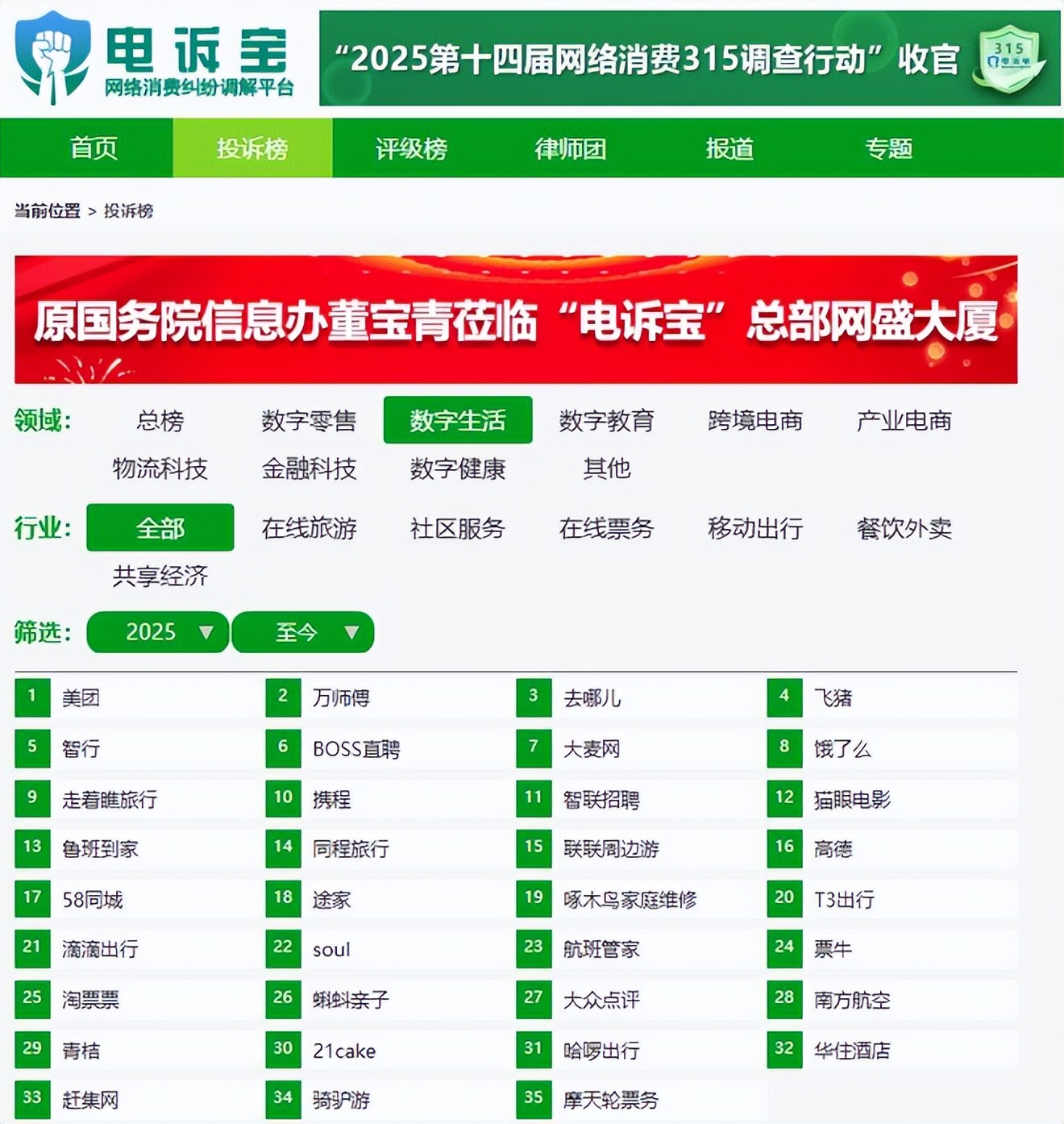 投訴量TOP10依次為:美團、萬師傅、飛豬、去哪兒、智行、走着瞧旅行、攜程、大麥網、魯班到家、高德;