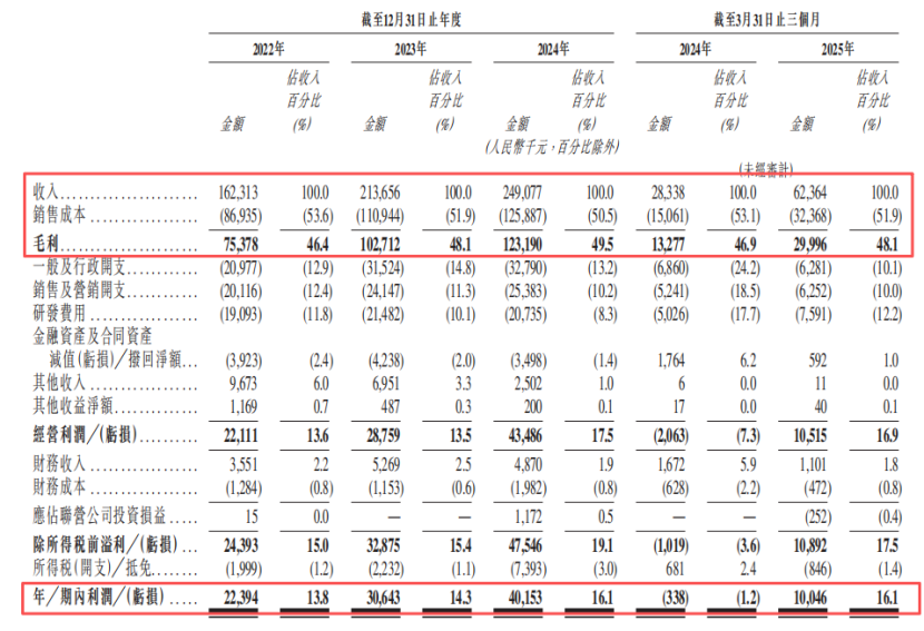 2022年、2023年、2024年、2025年1-3月(報告期),公司的收入分別為1.62億元、2.14億元、2.49億元、6236萬元,淨利潤分別為2239.4萬元、3064.3萬元、4015.3萬元、1004.6萬元,同期毛利率分別為46.4%、48.1%、49.5%、48.1%。
