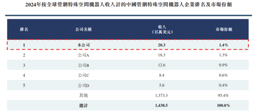 2024年中國管網特殊空間機器人企業在全球的排名及市場份額,來源:招股書