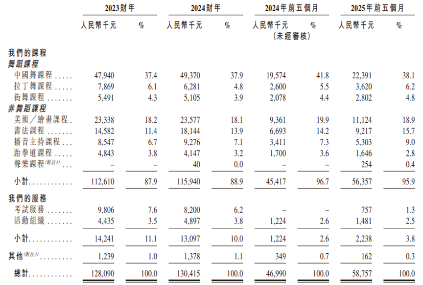 2025年前五個月,卓優智美有95.9%的收入來自提供課程。其中,中國舞課程的收入佔比最高,為38.1%;繪畫、書法課的收入佔比均超過15%。