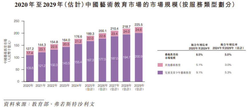 2024年中國藝術教育市場規模達到1766億元,預計到2029年將達到2255億元,2024年至2029年的複合年增長率為5%,略低於2020年至2024年8.5%的複合年增長率。