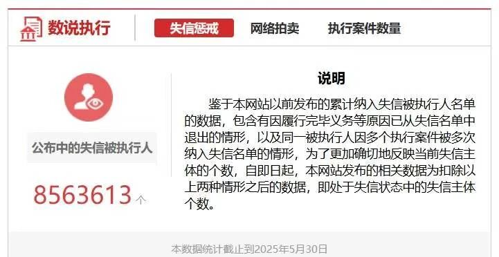根據數説執行的統計,到今年5月份,全國失信人數856萬人。最高法在年初曾發佈過2024年的一組數據,共有245.7萬人次納入失信人員名單,有282.1萬人次通過信用修復迴歸市場。失信名單人數10年來第一次下降。