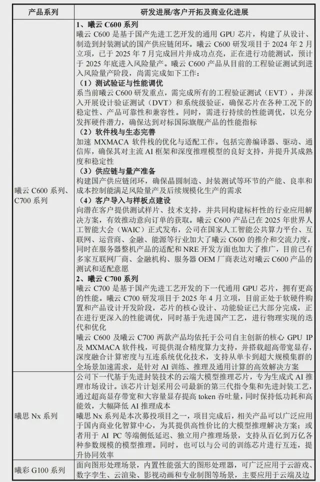 曦雲 C500 系列量產以後,沐曦其他在研產品主要包括基於國產供應鏈的訓推一體系列曦雲 C600、曦雲 C700 等,專為生成式 AI 推理市場設計的Nx系列,以及用於圖形渲染的曦彩G系列產品等,上述產品的研發、客户開拓及商業化進展情況如下。