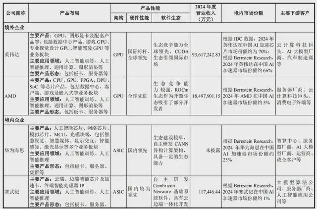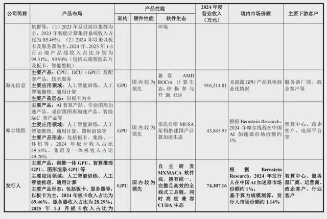 沐曦與境內外同行業公司在產品佈局、性能、業績規模、市場份額、主要下游客户等方面基本情況比較如下。