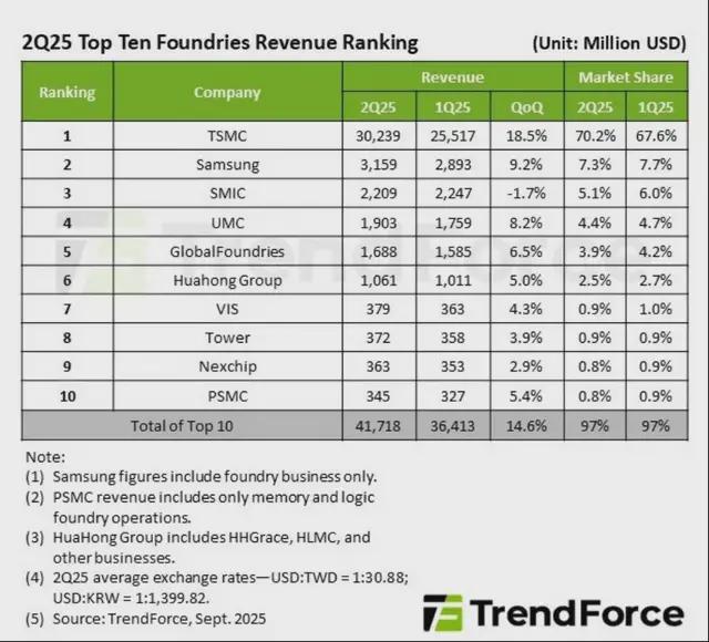 三星代工也公佈了穩健的業績,受益於智能手機需求和任天堂Switch 2 的銷量增長。出貨量主要集中在高價值先進節點,推動收入環比增長 9.2% 至 31.6 億美元,使該公司的市場份額達到7.3%,排名第二。