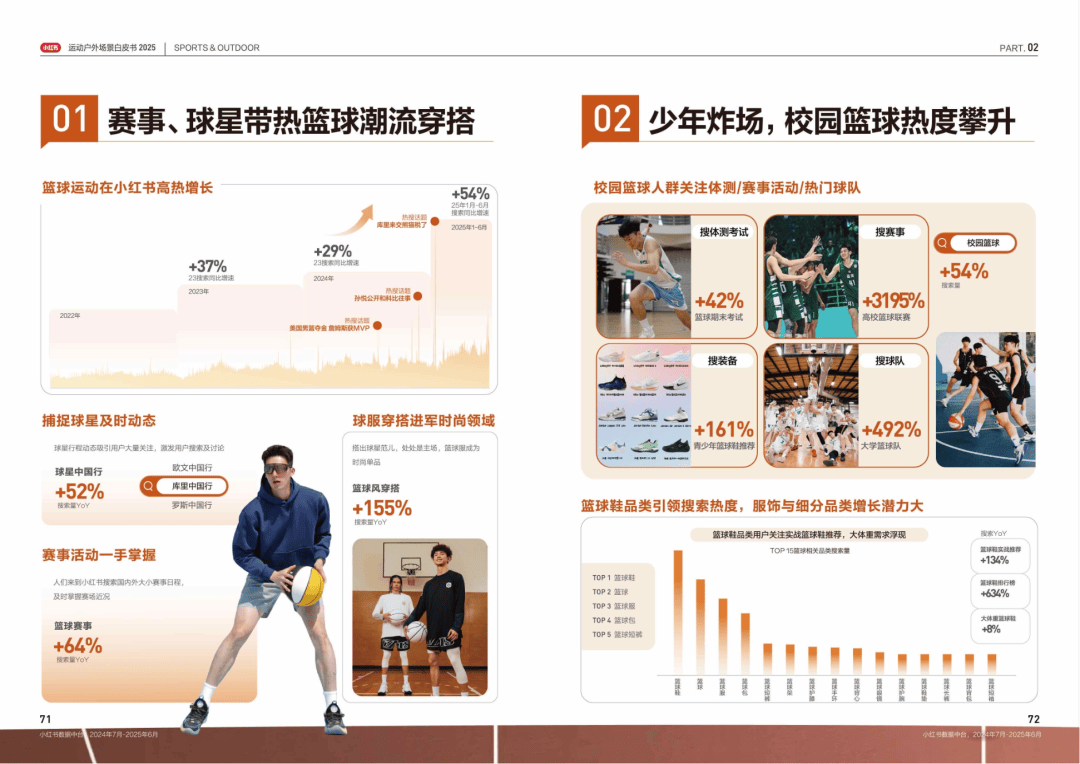 同時,羣眾基礎更為廣泛的籃球運動,小紅書同樣是重要發酵場,並孕育出獨特的校園籃球場景。隨着歐文、庫裏等NBA球星中國行活動的開展,帶動了平台籃球風穿搭相關搜索量增至155%,展現出籃球文化活力。