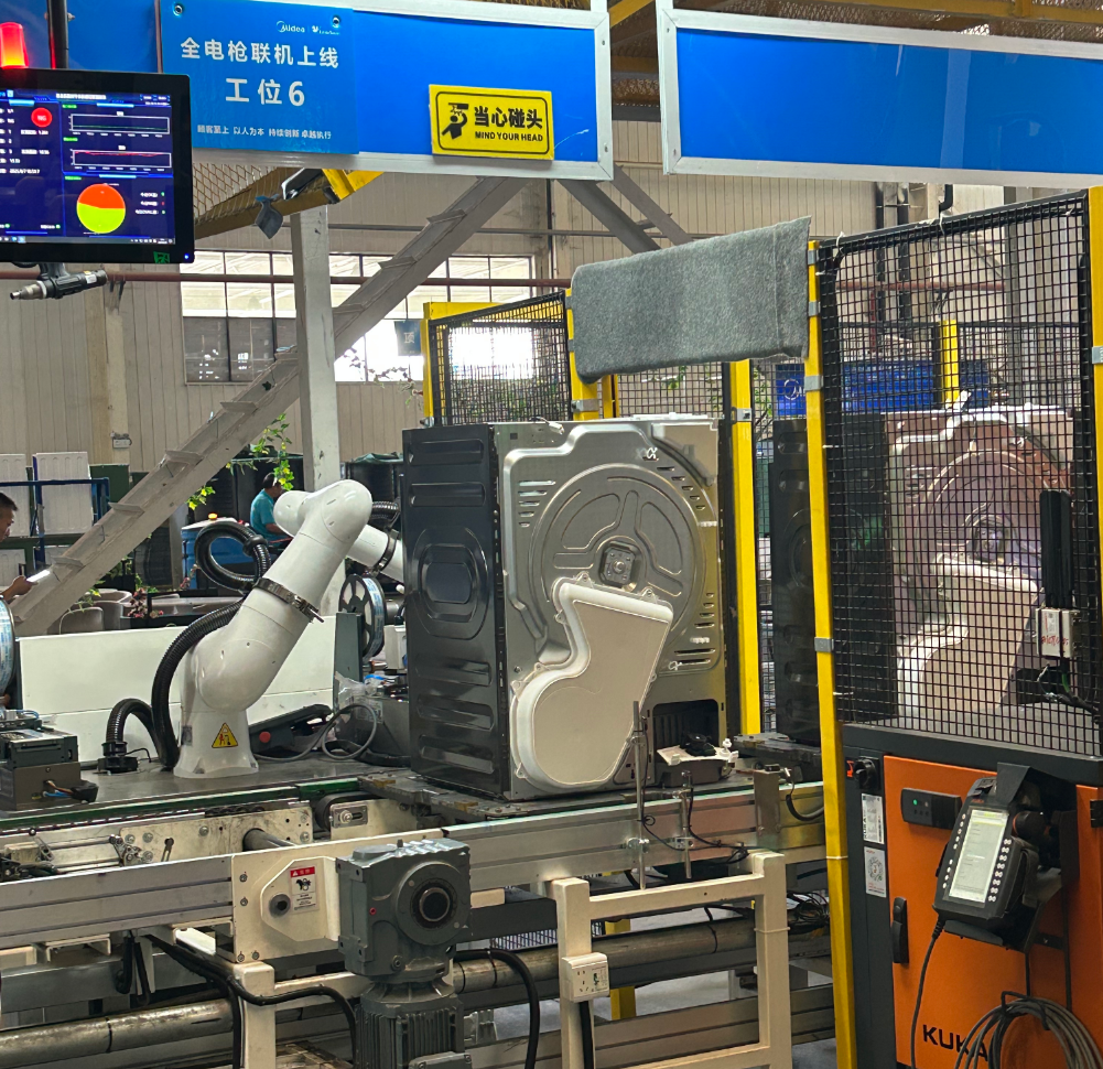 比如,乾衣機生產線上,庫卡最新研發的iico多關節協作機器人,正在飛快地給機器背面擰上螺絲。