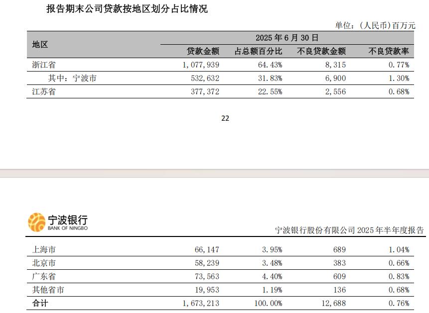 在“神仙打架”的背景下,寧波銀行截至 2025 年 6 月末,在浙江和江蘇貸款餘額分別佔全行貸款總額的 64.43%和22.55%,無論貸款餘額還是佔比,均較2024年同期大幅增加,“撿漏”能力一流。