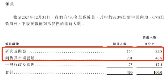 截至2024年12月31日,公司共有430名全職員工,其中銷售及市場營銷的員工201人,佔總人數的比例高達46.8%。