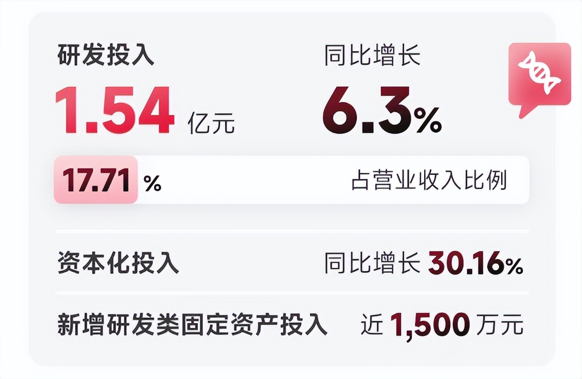 今年上半年,該公司研發投入總額達1.54億元,同比增長6.3%,佔營收比例達17.71%,其中資本化投入同比增長30.16%。