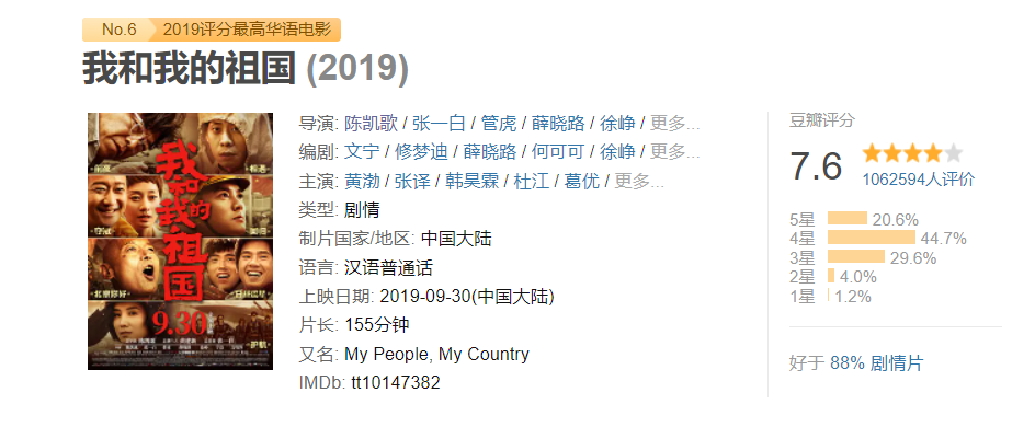 如今的主旋律電影,雖然重大革命歷史題材也還在拍,《建國大業》三部曲,《長津湖》,但如今新時代主旋律電影,也有了新的內容,比如建國70週年獻禮電影《我和我的祖國》