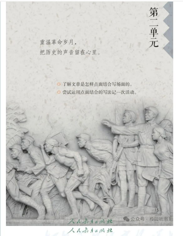 在25篇課文內容裏面,各類紅色革命歷史題材內容,佔了10篇,差不多是一半比例,從內容長度來看,更是接近了一半篇幅。第二單元開宗明義,“重温革命歲月,把歷史的聲音留在心裏。”
