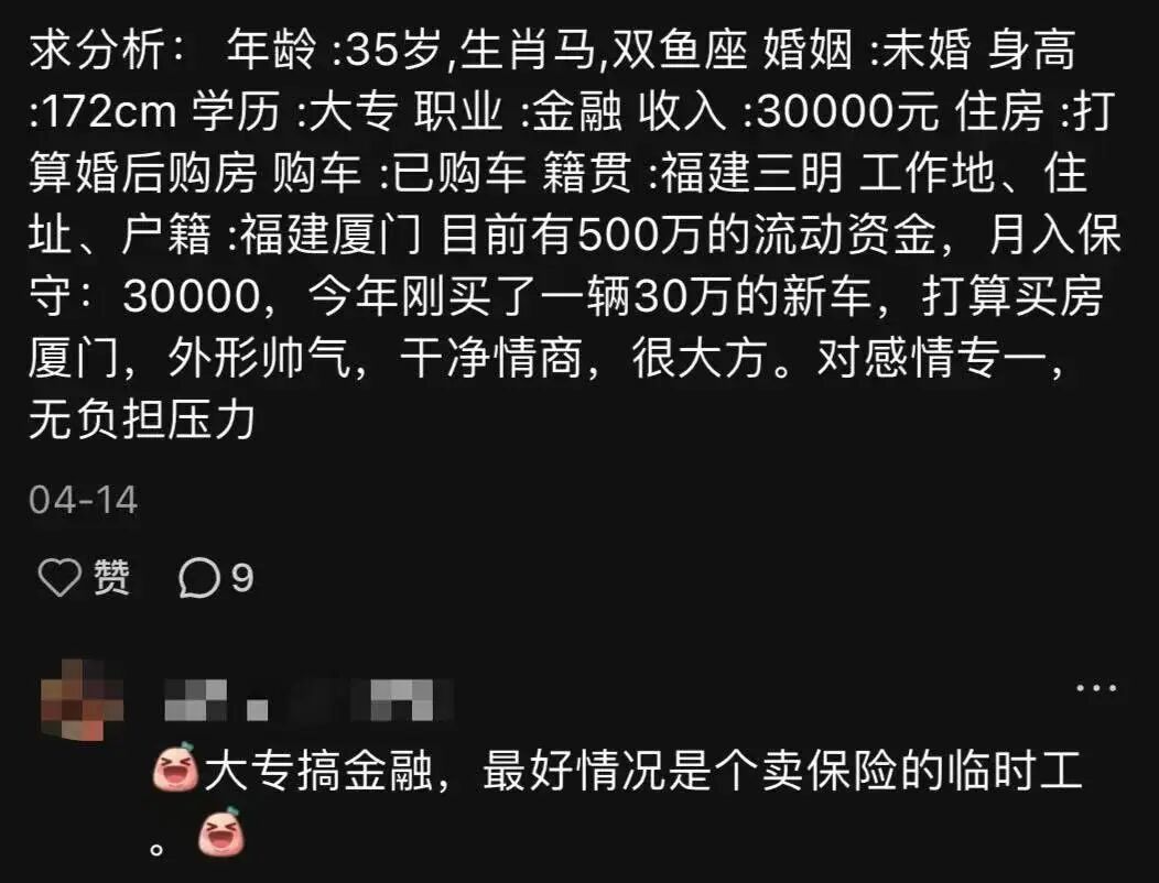 還有網友會在博主發佈的相親分析視頻下,發出自己的相親對象的個人信息,求點評。博主的回覆也是一針見血,透過現象看本質。