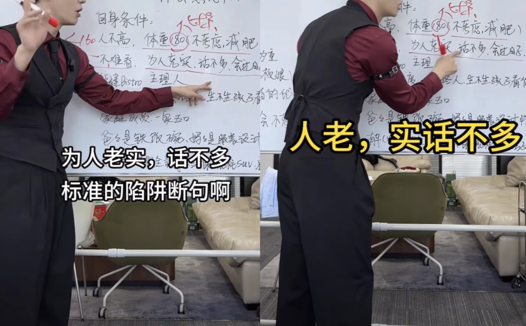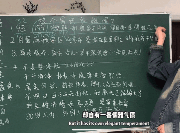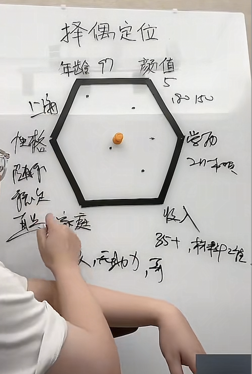 只需一塊白板、幾個語焉不詳的個人條件,這些自封為“相親分析師”的主播就能從中抽絲剝繭,找到相親對象試圖隱藏的秘密信息,評估一個人的“婚戀競爭力”。