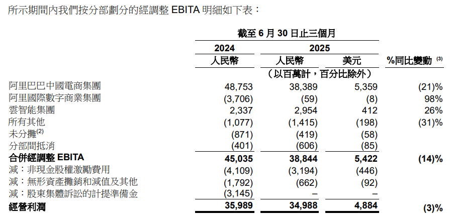 作為集團利潤核心的 “ 阿里巴巴中國電商集團 ”,經調整 EBITA 同比**下降 21%**至 384 億元。