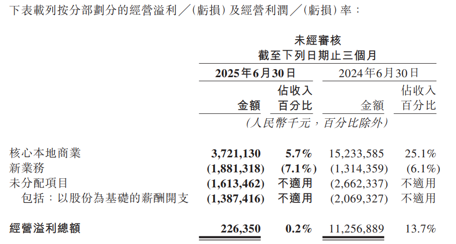 核心本地商業模塊經營溢利同比下降 75.6% 至人民幣 37 億元,經營利潤率同比下降 19.4 個百分點至 5.7% 。
