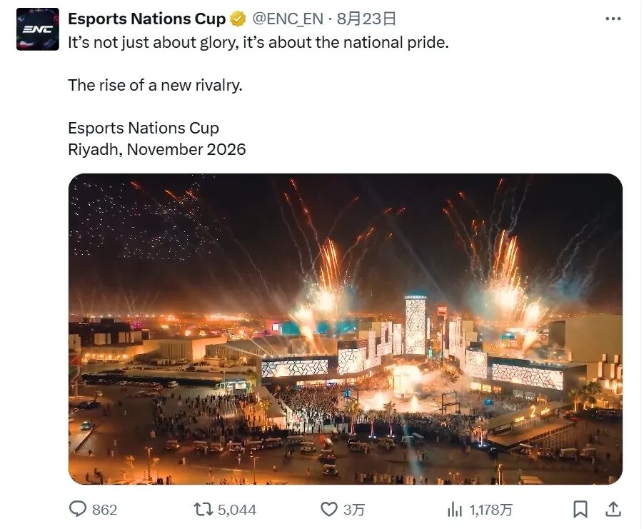 **電子競技國家杯(Esports Nations Cup)**是沙特辦賽的下一步大動作,相比由俱樂部與選手個人參加為主的電競世界盃,這場“國家杯”將全部以國家隊的形式展開競技對決。