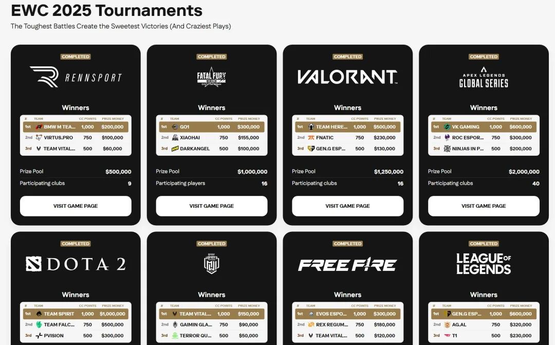 首屆電競世界盃於2024年正式舉辦,包含23項賽事,涵蓋22款遊戲,總獎金高達6250萬美元,創下當年電競史上的最高獎金紀錄開局,狠狠彰顯了中東大户的**“鈔能力”**。
