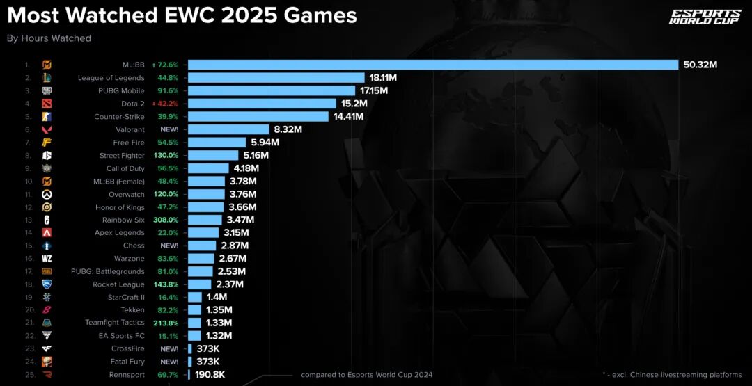 高投入同樣收穫了高回報,實地前往本屆電競世界盃觀賽的觀眾高達300萬人次,線上直播觀看時長超 3.5億小時,觀眾羣體覆蓋了35種語言與100多個國家。