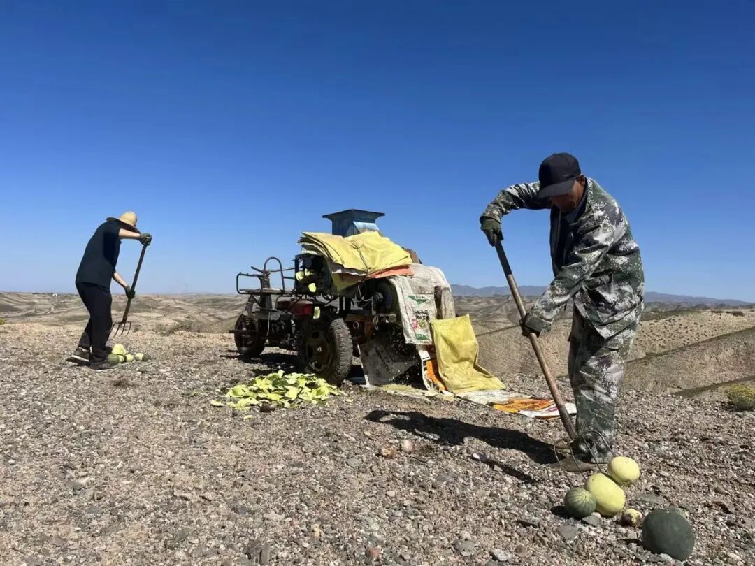 風從塬上吹過,捲起細小的塵土,粘在了甘肅省靖遠縣眾多瓜農被汗水浸濕的衣褲和手上。遠遠望去,天地蒼茫,人渺小得如同貼在大地上的剪影。在這裏,五十畝的西瓜地能產出多少西瓜?農户又能賺到多少錢?答案是兩卡車,約三十噸,平均一斤賣一毛五。