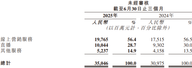 從營收結構上來看,快手核心收入分為三類——線上營銷服務、直播、其他服務(電商和可靈AI業務),這三部分共同構成了快手營收的主要來源,分別佔比56.4%、28.7%、14.9%。
