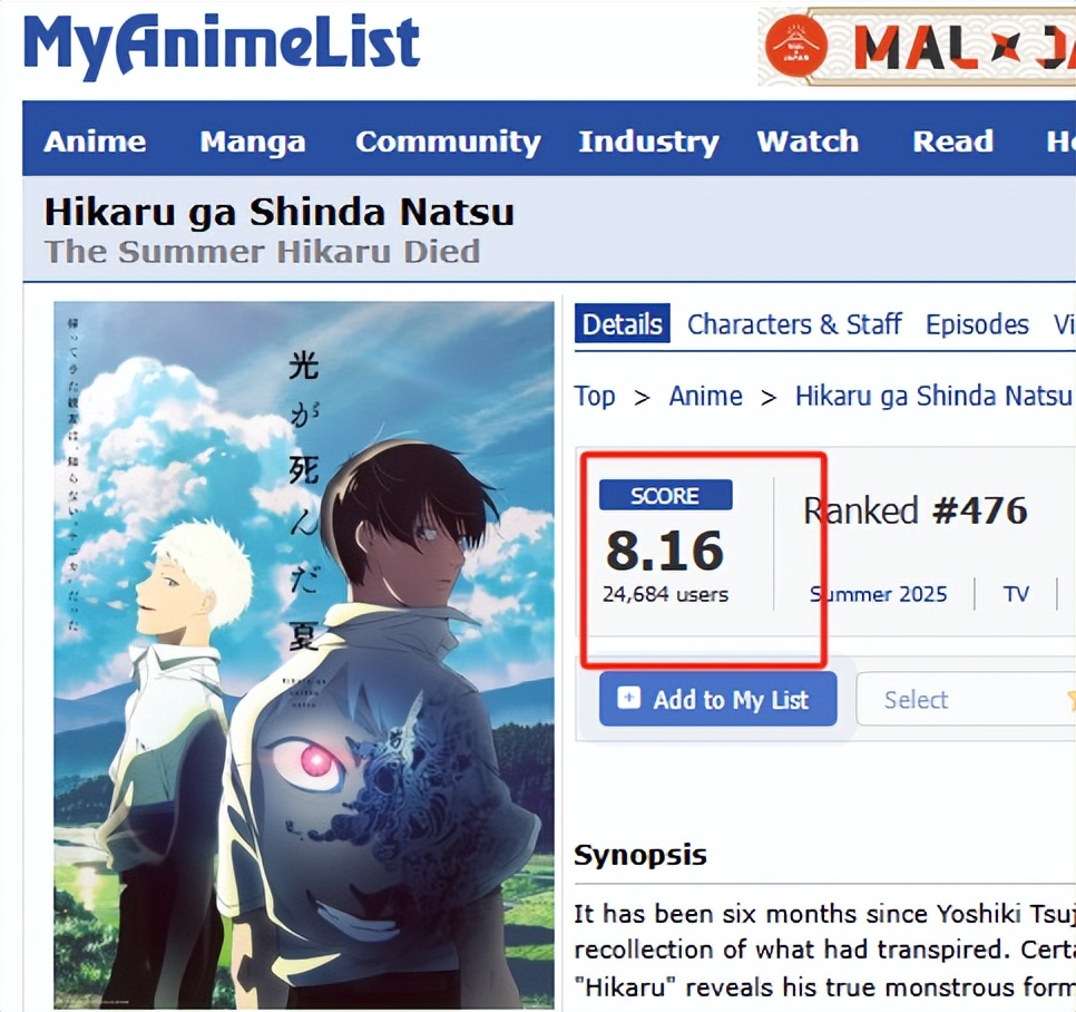 在更為客觀與權威的MyAnimelist網站裏,它的評分則好一些,來到了8.2分;