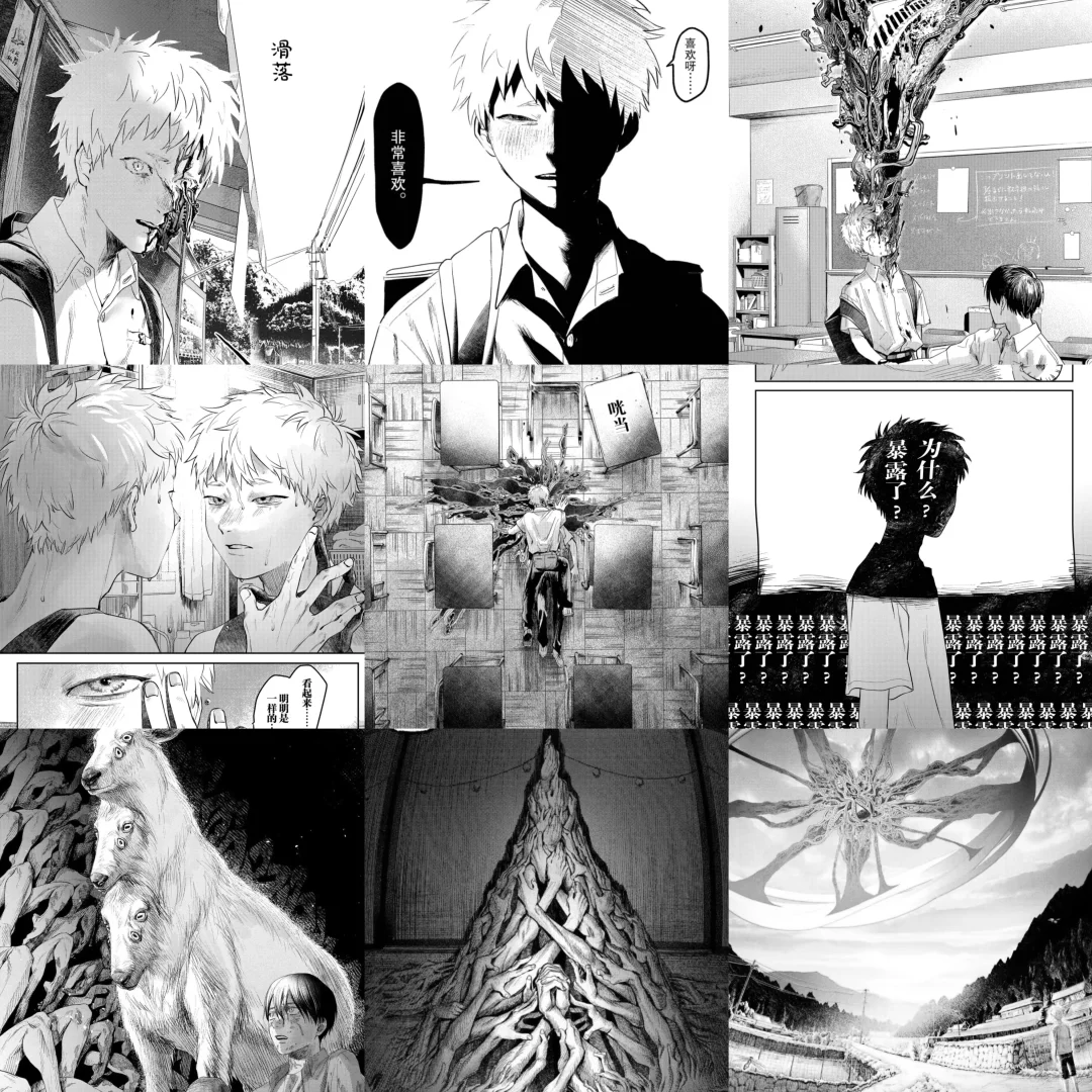 無論是纖細、漂亮的少年們;駭人且怪誕的妖魔,還是普通、卻處處透着違和的環境,自她筆下流淌,匯成一幕幕奇詭的分鏡,並自然而然地營造出一種粘滯的、如附骨之疽一般令人戰慄的涼意。