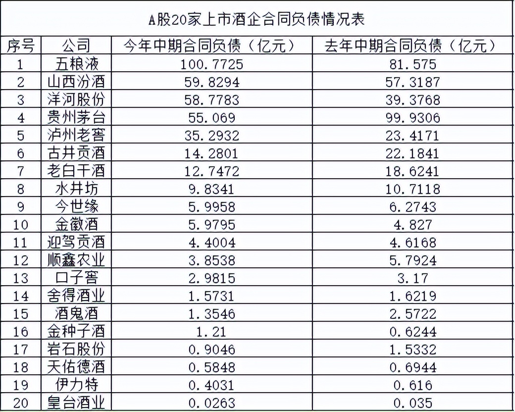 截至今年上半年末,20家A股白酒上市企業合同負債合計為375.87億元,同比下降約2.5%。其中,五糧液、山西汾酒、瀘州老窖等6家酒企合同負債同比增長,另外14家酒企合同負債同比下滑。