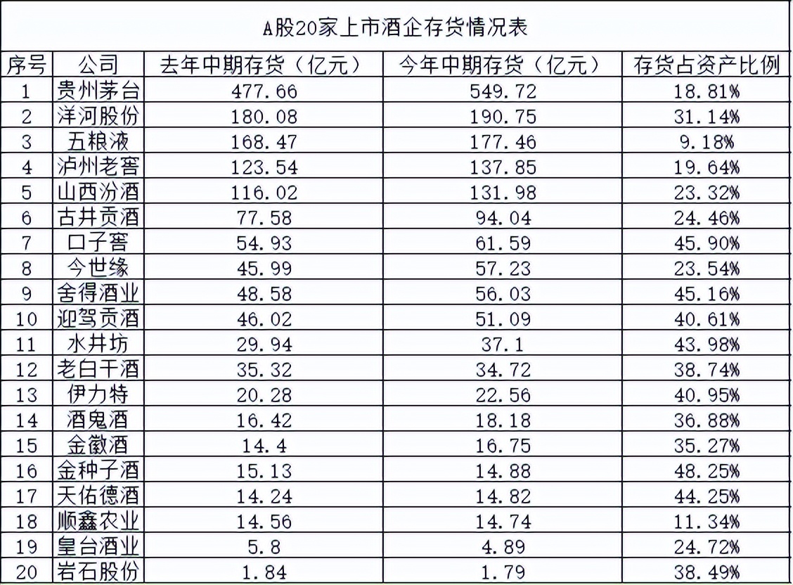 截至今年上半年末,貴州茅台以549.72億元存貨居首,佔20家企業總存貨的32.6%,其存貨規模超過排名後16家酒企的總和。除貴州茅台外,存貨資產超百億元的,還有洋河股份、五糧液、瀘州老窖、山西汾酒四家酒企,分別為190.75億元、177.46億元、137.85億元、131.98億元。